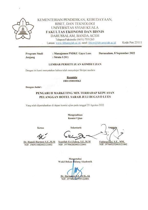 Rosmida, PENGARUH MARKETING MIX TERHADAP KEPUASAN PELANGGAN HOTEL SARAH JULI DI GAYO LUES. Banda Aceh Fakultas Ekonomi,2022