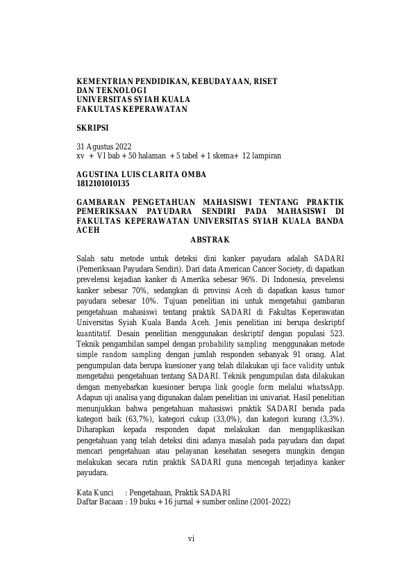 Baca Juga : GAMBARAN PENGETAHUAN MAHASISWI TENTANG PEMERIKSAAN PAYUDARA SENDIRI (SADARI) DI FAKULTAS KEPERAWATAN UNIVERSITAS SYIAH KUALA (Agustina Luis Clarita Omba, 2022)