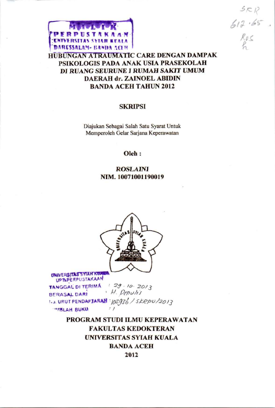 Roslaini, HUBUNGAN ATRAUMATIC CARE DENGAN DAMPAK PSIKOLOGIS PADA ANAK USIA PRASEKOLAH DI RUANG SEURUNE 1 RUMAH SAKIT UMUM DAERAH DR.ZAINOEL ABIDIN BANDA ACEH TAHUN 2012. Banda Aceh Fakultas Kedokteran,2012