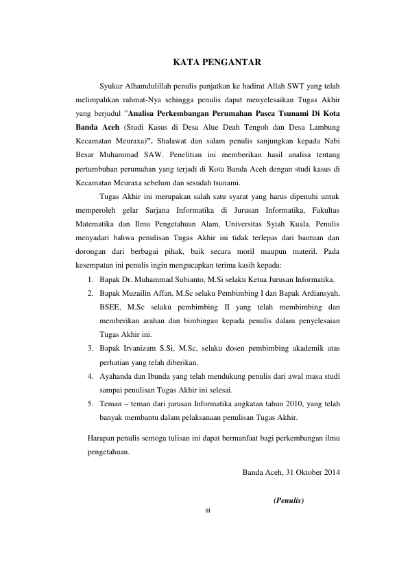 Julfan Chaliz, ANALISA PERKEMBANGAN PERUMAHAN PASCA TSUNAMI DI KOTA BANDA ACEH (STUDI KASUS DI DESA ALUE DEAH TENGOH DAN DESA LAMBUNG KECAMATAN MEURAXA). Banda Aceh Fakultas Matematika dan Ilmu Pengetahuan Alam,2014