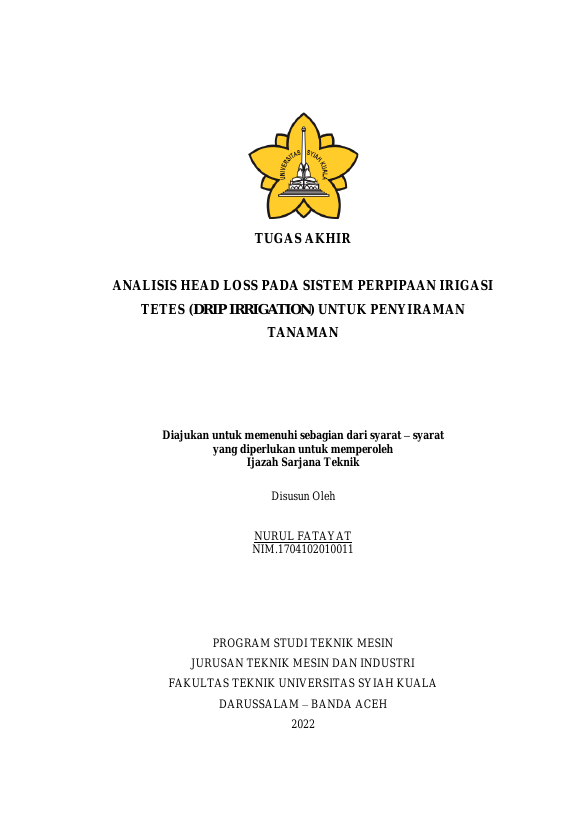 Nurul Fatayat, ANALISIS HEAD LOSS PADA SISTEM PERPIPAAN IRIGASI TETES (DRIP IRRIGATION) UNTUK PENYIRAMAN TANAMAN. Banda Aceh Fakultas Teknik Mesin,2022