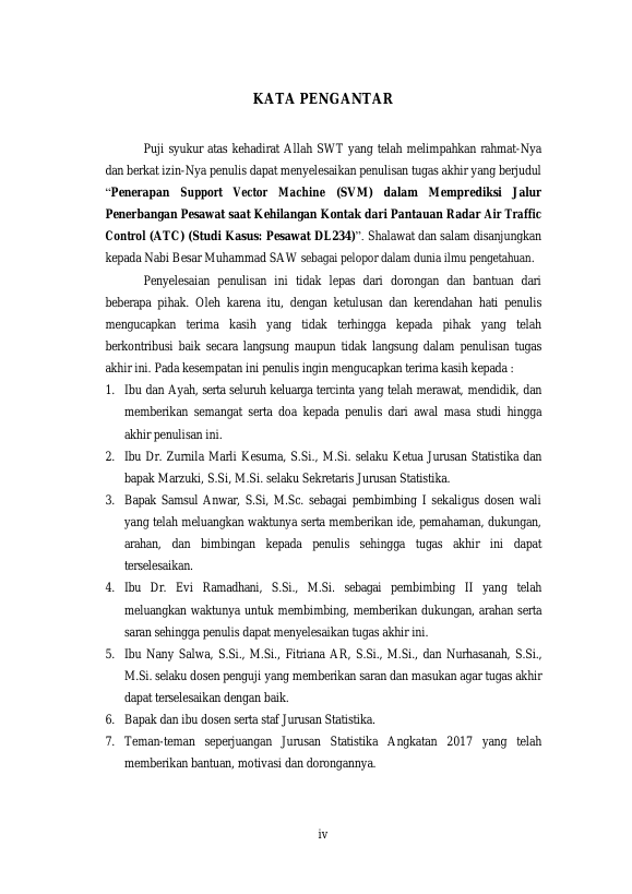 PUTRI ANANDA, PENERAPAN SUPPORT VECTOR MACHINE (SVM) DALAM MEMPREDIKSI JALUR PENERBANGAN PESAWAT SAAT KEHILANGAN KONTAK DARI PANTAUAN RADAR AIR TRAFFIC CONTROL (ATC) (STUDI KASUS: PESAWAT DL234). Banda Aceh Fakultas MIPA Statistika,2022