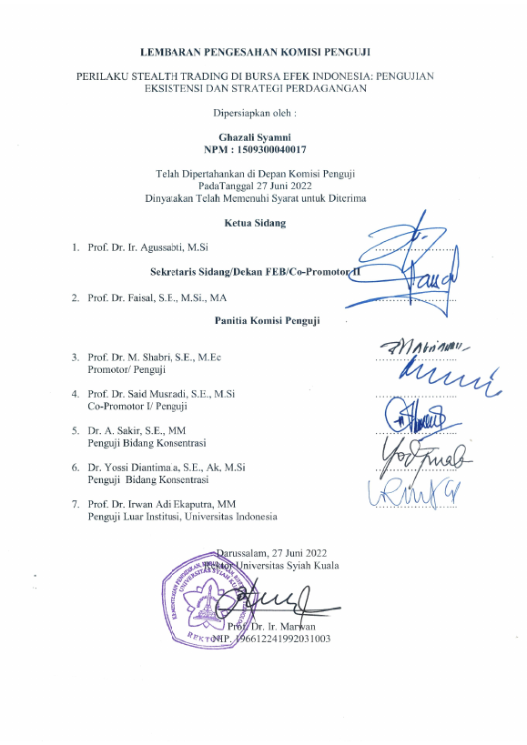GHAZALI SYAMNI, PERILAKU STEALTH TRADING DI BURSA EFEK INDONESIA: PENGUJIAN EKSISTENSI DAN STRATEGI PERDAGANGAN. Banda Aceh Program Dokor Ilmu Manajemen,2022