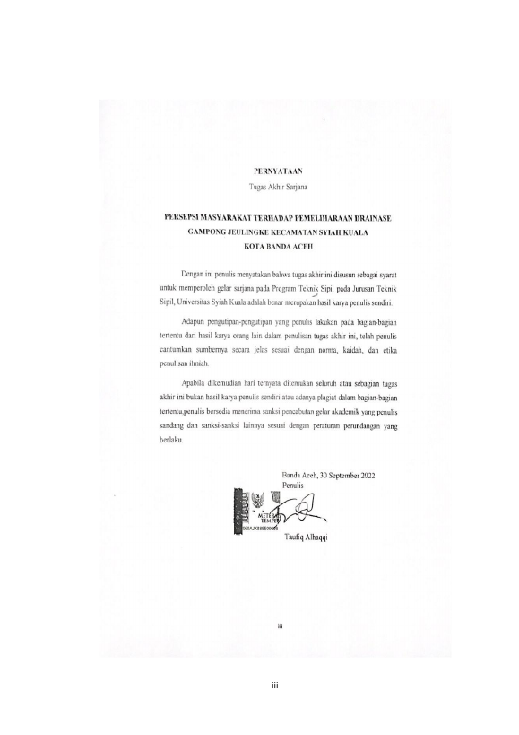 TAUFIQ ALHAQQI, PERSEPSI MASYARAKAT TERHADAP PEMELIHARAAN DRAINASE GAMPONG JEULINGKE KECAMATAN SYIAH KUALA KOTA BANDA ACEH. Banda Aceh Fakultas Teknik,2022
