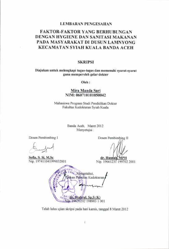 Mira manda Sari, FAKTOR-FAKTOR YANG BERHUBUNGAN DENGAN HYGIENE DAN SANITASI MAKANAN PADA MASYARAKAT DI DUSUN LAMNYONG KECAMATAN SYIAH KUALA BANDA ACEH. Banda Aceh Fakultas Kedokteran,2012