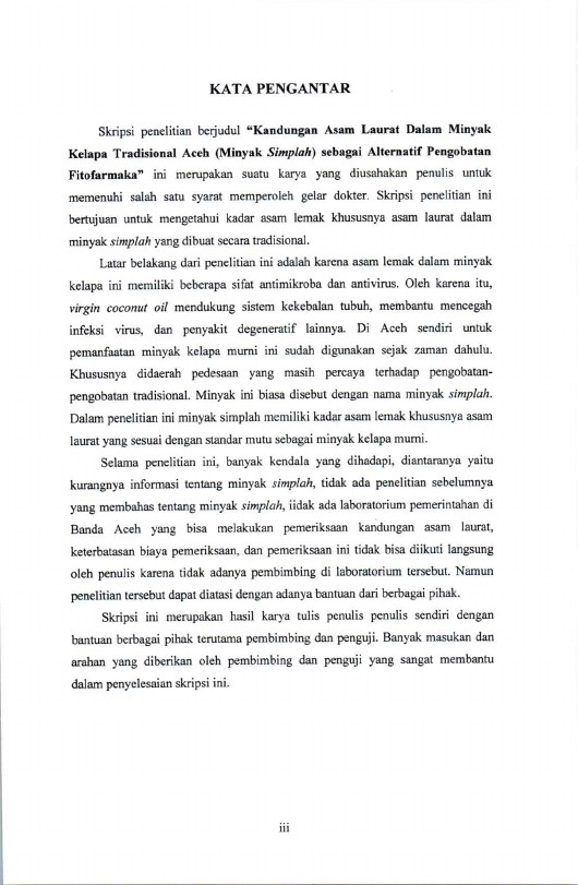Marissa Hayati, KANDUNGAN ASAM LAURAT DALAM MINYAK KELAPA TRADISIONAL ACEHRN(MINYAK SIMPLAH)RNSEBAGAI ALTERNATIF PENGOBATAN FITOFARMAKA. Banda Aceh Fakultas Kedokteran,