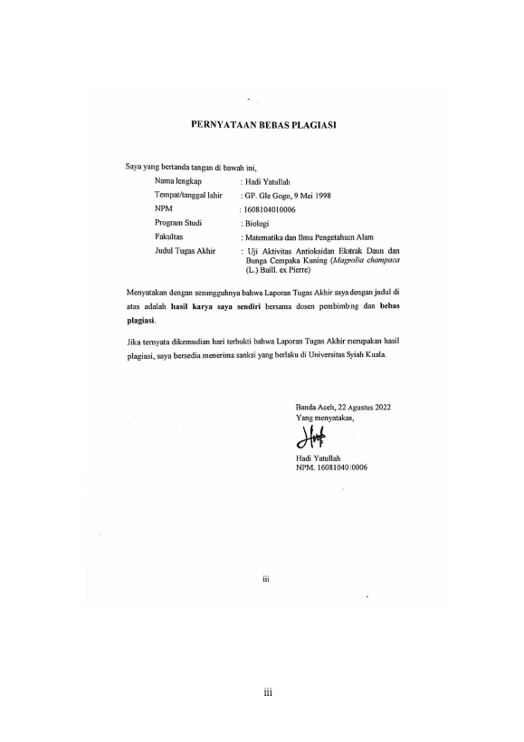 Baca Juga : PEMANFAATAN EKSTRAK N-HEKSANA BUNGA CEMPAKA (MICHELI CHAMPACA) SEBAGAI ANTIOKSIDAN DAN KARAKTERISASINYA DENGAN MENGGUNAKAN GC-MS (Ervan Samsuri, 2024)
