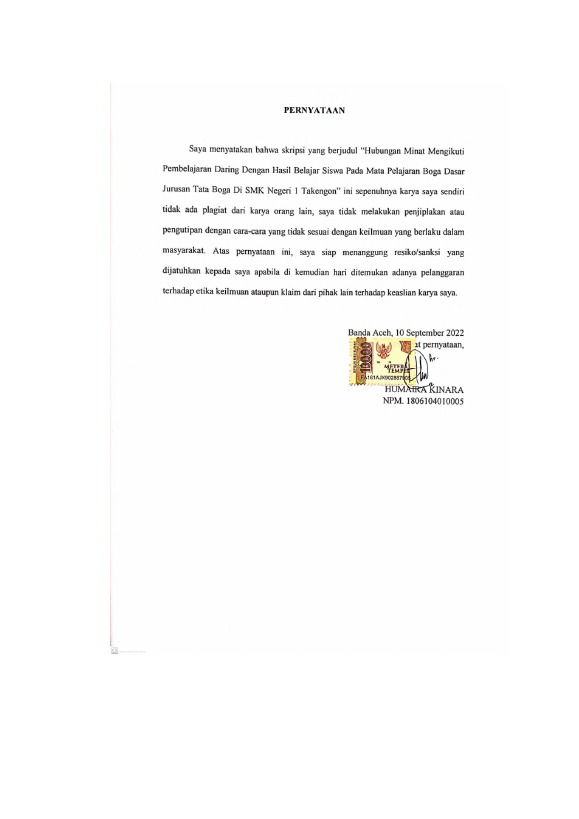 Humaira Kinara, HUBUNGAN MINAT MENGIKUTI PEMBELAJARAN DARING DENGAN HASIL BELAJAR PADA MATA PELAJARAN BOGA DASAR JURUSAN TATA BOGA DI SMK NEGERI I TAKENGON. Banda Aceh Fakultas KIP PKK,2022