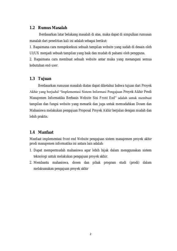 Reza Sulthani, IMPLEMENTASI SISTEM INFORMASI PENGAJUAN PROYEK AKHIR PRODI MANAJEMEN INFORMATIKA BERBASIS WEBSITE PADA SISI FRONT END. Banda Aceh D III-Manajemen Informatika,2022
