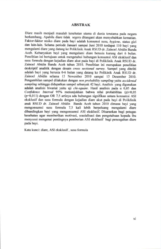 Deny Indahwaty, HUBUNGAN KONSUMSI ASI EKSKLUSIF DAN SUSU FORMULA DENGAN KEJADIAN DIARE AKUT PADA BAYI DI POLIKLINIK ANAK RSUD DR.ZAINOEL ABIDIN BANDA ACEH TAHUN 2010. Banda Aceh Fakultas Kedokteran,2011