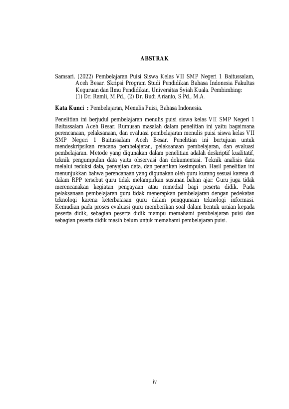Samsari, PEMBELAJARAN PUISI SISWA KELAS VII SMP NEGERI 1 BAITUSSALAM ACEH BESAR. Banda Aceh Fakultas KIP,2022