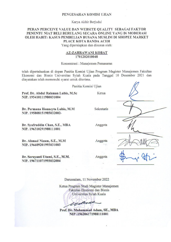 AZ-ZAHRAWANI KOBAT, PERAN PERCEIVE VALUE DAN WEBSITE QUALITY SEBAGAI FAKTOR PENENTU NIAT BELI BERULANG SECARA ONLINE YANG DI MODERASI OLEH HABIT: KASUS PEMBELIAN BUSANA MUSLIM DI SHOPEE MARKET PLACE KOTA BANDA ACEH. Banda Aceh Fakultas Ekonomi dan Bisnis (S2),2022