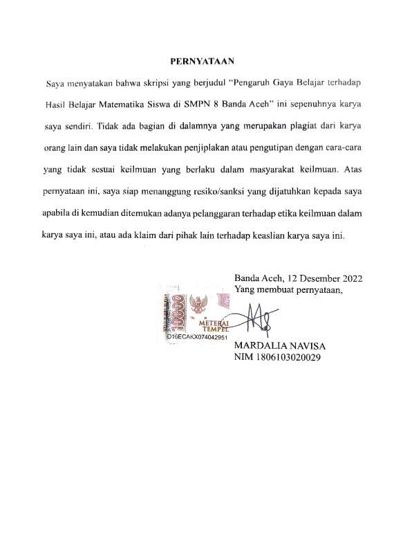 Baca Juga : GAYA BELAJAR SISWA PADA PEMBELAJARAN MATEMATIKA DI KELAS VIII SMPN 10 BANDA ACEH (Dewi Arsita, 2020)