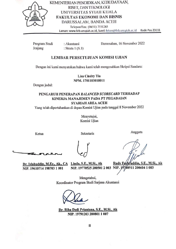 LISA CINDRY TIA, PENGARUH PENERAPAN BALANCED SCORECARD TERHADAP KINERJA MANAJEMEN PADA PT PEGADAIAN SYARIAH AREA ACEH. Banda Aceh Fakultas Ekonomi dan Bisnis (S1),2022