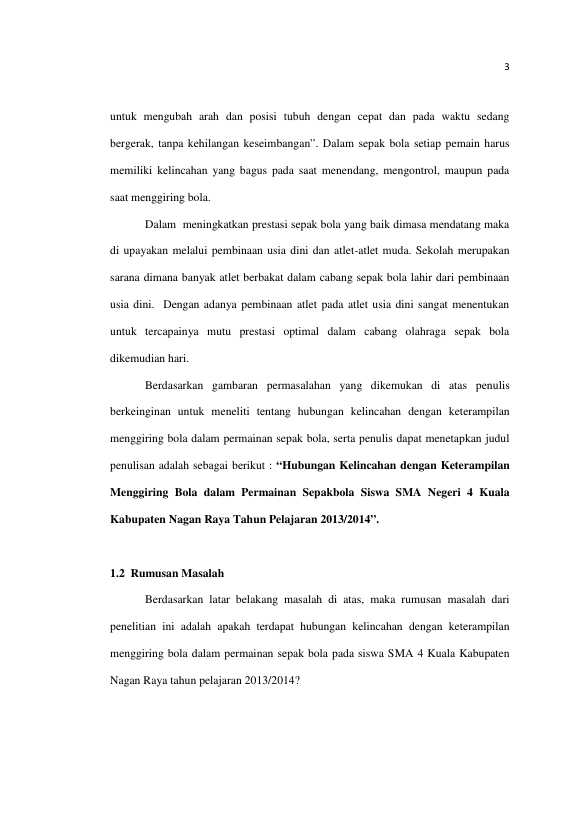 SAHLAN, HUBUNGAN KELINCAHAN DENGAN KETERAMPILAN MENGGIRING BOLA DALAM PERMAINAN SEPAKBOLA SISWA SMA NEGERI 4 KUALA KABUPATEN NAGAN RAYA TAHUN PELAJARAN 2013/2014. Banda Aceh Fakultas Keguruan dan Ilmu Pendidikan,2014