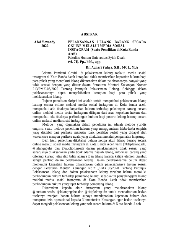 ALWI YOVANDY, PELAKSANAAN LELANG BARANG SECARA ONLINE MELALUI MEDIA SOSIAL INSTAGRAM (SUATU PENELITIAN DI KOTA BANDA ACEH). Banda Aceh Fakultas Hukum (S1),2022