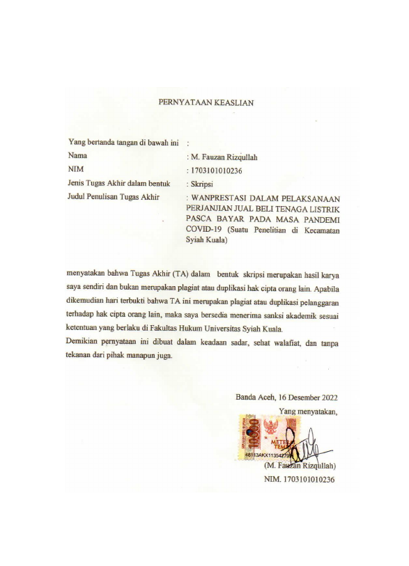 MUHAMMAD FAUZAN RIZQULLAH, WANPRESTASI DALAM PELAKSANAAN PERJANJIAN JUAL BELI TENAGA LISTRIK PASCA BAYAR PADA MASA PANDEMI COVID-19 (SUATU PENELITIAN DI KECAMATAN SYIAH KUALA). Banda Aceh Fakultas Hukum,2022