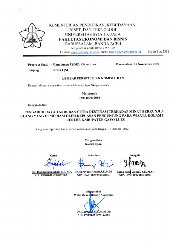 Maimunah, PENGARUH DAYA TARIK DAN CITRA DESTINASI TERHADAP MINAT BERKUNJUNG ULANG YANG DIMEDIASI OLEH KEPUASAN PENGUNJUNG PADA WISATA KOLAM BIRU REREBE KABUPATEN GAYO LUES. Banda Aceh Fakultas Ekonomi dan Bisnis (S1),2022