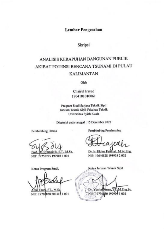 CHAIRUL IRSYAD, ANALISIS KERAPUHAN BANGUNAN PUBLIK AKIBAT POTENSI BENCANA TSUNAMI DI PULAU KALIMANTAN. Banda Aceh Fakultas Teknik Sipil,2022