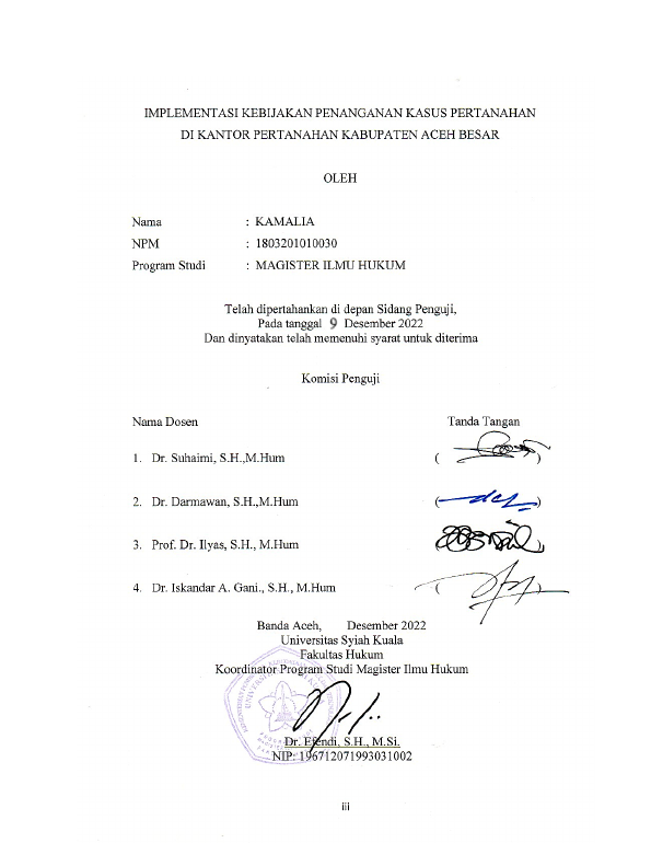 Kamalia, IMPLEMENTASI KEBIJAKAN PENANGANAN KASUS PERTANAHAN DI KANTOR PERTANAHAN KABUPATEN ACEH BESAR. Banda Aceh Fakultas Hukum (S2),2022