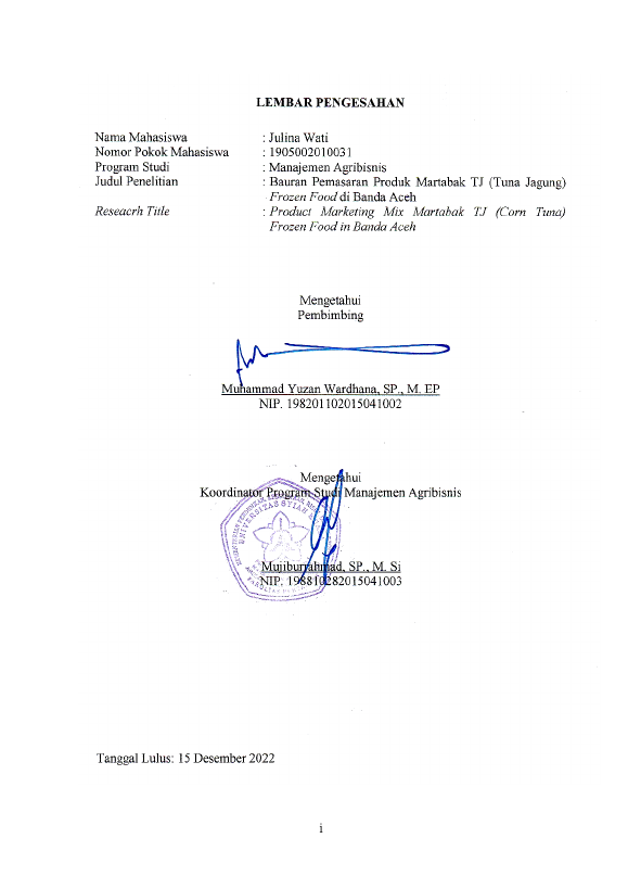 Julina Wati, BAURAN PEMASARAN PRODUK MARTABAK TJ (TUNA JAGUNG) RNFROZEN FOOD DI BANDA ACEH. Banda Aceh Fakultas Pertanian (D3),2022