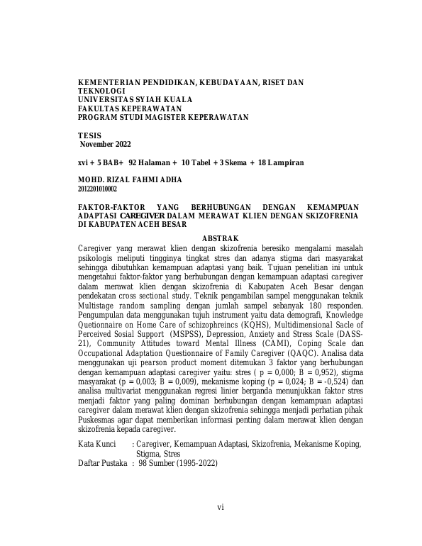 Mohd. Rizal Fahmi Adha, FAKTOR-FAKTOR YANG BERHUBUNGAN DENGAN KEMAMPUAN ADAPTASI CAREGIVER DALAM MERAWAT KLIEN DENGAN SKIZOFRENIA DI KABUPATEN ACEH BESAR. Banda Aceh Prog. Studi Magister Keperawatan,2022
