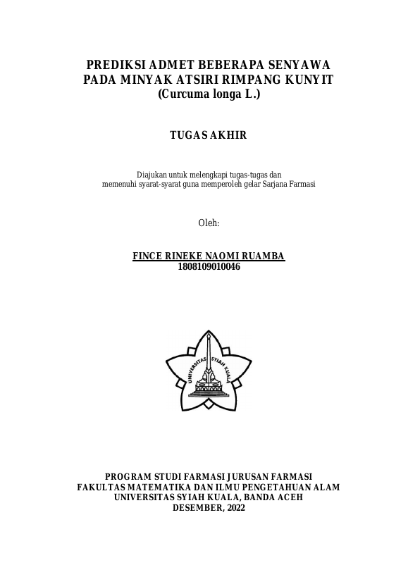 Fince Rineke Naomi Ruamba, PREDIKSI ADMET BEBERAPA SENYAWA PADA MINYAK ATSIRI RIMPANG KUNYIT (CURCUMA LONGA L.). Banda Aceh Fakultas MIPA Farmasi,2022
