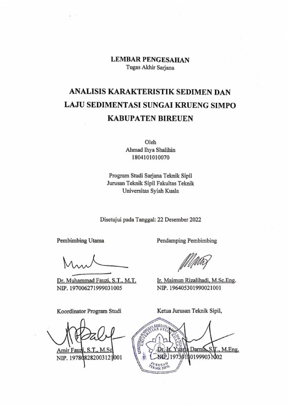 AHMAD IHYA SHALIHIN, ANALISIS KARAKTERISTIK SEDIMEN DAN LAJU SEDIMENTASI SUNGAI KRUENG SIMPO KABUPATEN BIREUEN. Banda Aceh Fakultas Teknik Sipil,2022