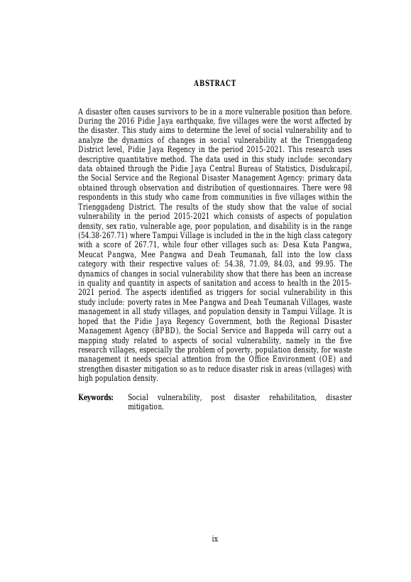 Baca Juga : KAJIAN TINGKAT KERENTANAN SOSIAL DI KECAMATAN TRIENGGADENG PASCA GEMPA BUMI PIDIE JAYA 2016 (Rinaldy Maulidin, 2022)
