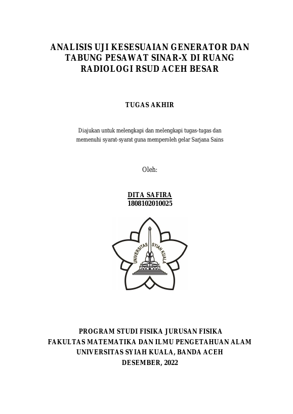 DITA SAFIRA, ANALISIS UJI KESESUAIAN GENERATOR DAN TABUNG PESAWAT SINAR-X DI RUANG RADIOLOGI RSUD ACEH BESAR. Banda Aceh Fakultas mipa,2023