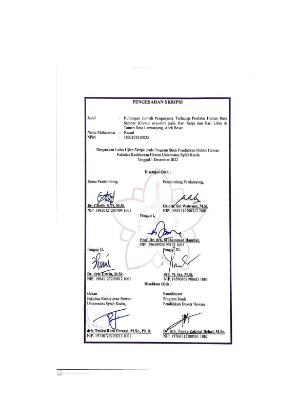 Baca Juga : HUBUNGAN JUMLAH PENGUNJUNG TERHADAP PERILAKU HARIAN RUSA SAMBAR (CERVUS UNICOLOR) PADA HARI KERJA DAN HARI LIBUR DI TAMAN RUSA LAMTANJONG, ACEH BESAR (Nasrul, 2023)