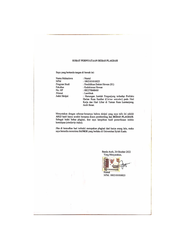 Baca Juga : HUBUNGAN JUMLAH PENGUNJUNG TERHADAP PERILAKU HARIAN RUSA SAMBAR (CERVUS UNICOLOR) PADA HARI KERJA DAN HARI LIBUR DI TAMAN RUSA LAMTANJONG, ACEH BESAR (Nasrul, 2023)