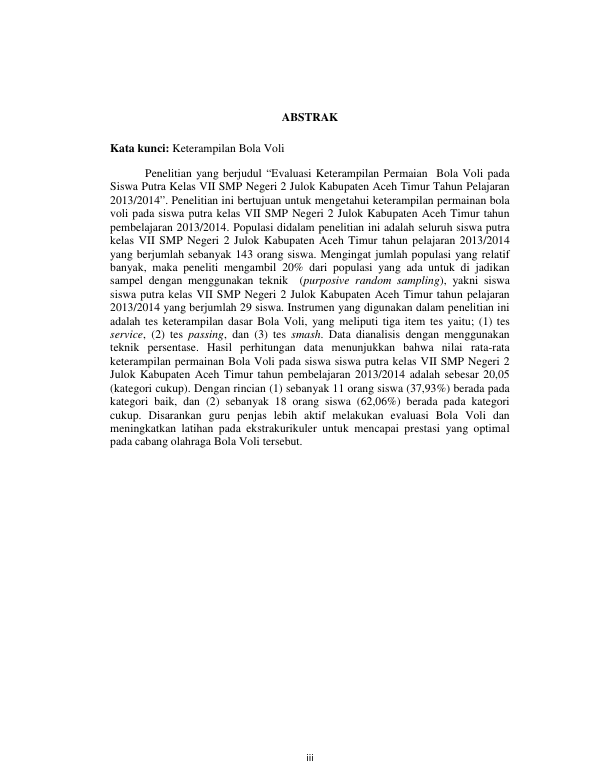 M. YAKOP, EVALUASI KETERAMPILAN PERMAIAN BOLA VOLI PADA SISWA PUTRA KELAS VII SMP NEGERI 2 JULOK KABUPATEN ACEH TIMUR TAHUN PELAJARAN 2013/2014. Banda Aceh Fakultas Keguruan dan Ilmu Pendidikan,2014