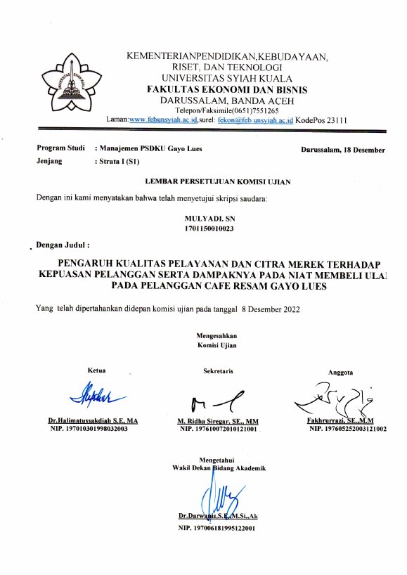 Mulyadi. SN, PENGARUH KUALITAS PELAYANAN DAN CITRA MEREK TERHADAP KEPUASAN PELANGGAN SERTA DAMPAKNYA PADA NIAT MEMBELI ULANG PADA PELANGGAN CAFE RESAM GAYO LUES. Banda Aceh Fakultas Ekonomi dan Bisnis,2023