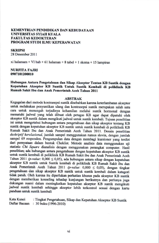 Nur Asiah, HUBUNGAN ANTARA PENGETAHUAN DAN SIKAP AKSEPTOR TENTANG KB SUNTIK DENGAN KEPATUHAN AKSEPTOR UNTUK SUNTIK KEMBALI DI POLIKLINIK KB RUMAH SAKIT IBU DAN ANAK PEMERINTAH ACEH TAHUN 2011. Banda Aceh Fakultas Kedokteran,2012