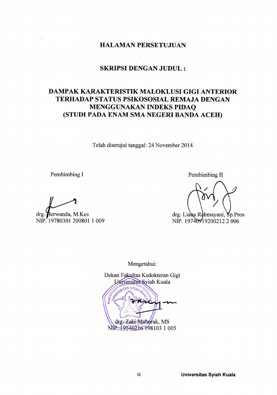 Baca Juga : DAMPAK KARAKTERISTIK MALOKLUSI GIGI ANTERIOR TERHADAP STATUS PSIKOSOSIAL REMAJA DENGAN MENGGUNAKAN INDEKS PIDAQ(STUDI PADA ENAM SMA NEGERI BANDA ACEH) (MULIA RAHMI, 2014)