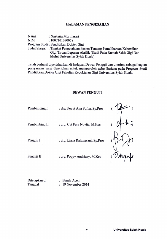NAZTASIA MURTILASARI, TINGKAT PENGETAHUAN PASIEN TENTANG PEMELIHARAAN KEBERSIHAN GIGI TIRUAN LEPASAN AKRILIK(STUDI PADA RUMAH SAKIT GIGI DAN MULUT UNIVERSITAS SYIAH KUALA). Banda Aceh Fakultas Kedokteran Gigi,2014