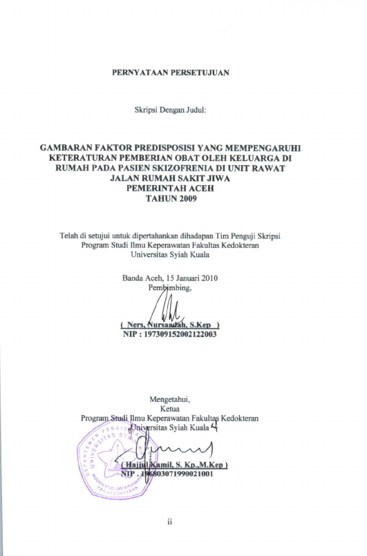 Radhiah, GAMBARAN FAKTOR PREDISPOSISI YANG MEMPENGARUHI KETERATURAN PEMBERIAN OBAT OLEH KELUARGA DI RUMAH PADA PASIEN SKIZOFRENIA DI UNIT RAWAT JALAN RUMAH SAKIT JIWA PEMERINTAH ACEH. Banda Aceh Fakultas Kedokteran,2010