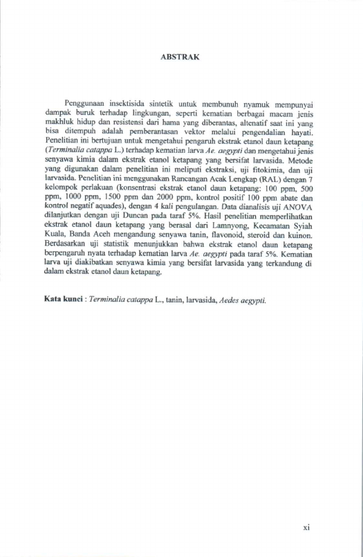 Fitri Maiyani, PENGARUH EKSTRAK ETANOL DAUN KETAPANG (TERMINALIA CATAPPA L.) TERHADAP MORTALITAS LARVA NYAMUK AEDES AEGYPTI. Banda Aceh Fakultas Kedokteran,2011