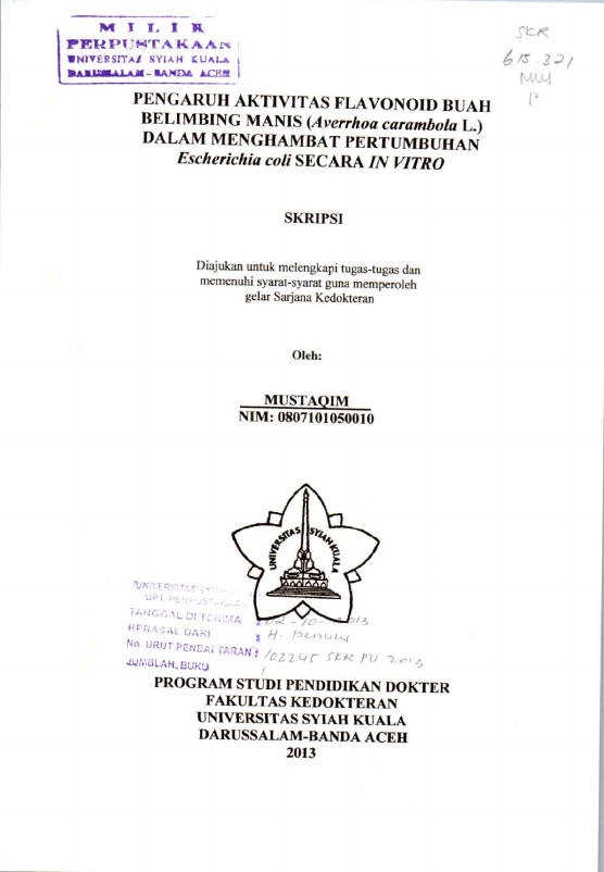 Mustaqim, PENGARUH AKTIVITAS FLAVONOID BUAH BELIMBING MANIS (AVERRHOA CARAMBOLA L.) DALAM MENGHAMBAT PERTUMBUHAN ESCHERICHIA COLI SECARA IN VITRO. Banda Aceh Fakultas Kedokteran,