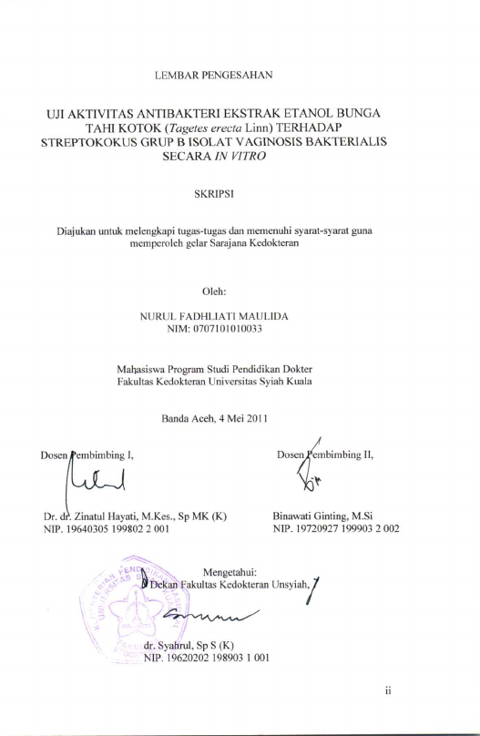 Nurul Fadhliati Maulida, UJI AKTIVITAS ANTIBAKTETRI EKSTRAK ETANOL BUNGA TAHI KOTOK (TAGETES ERECTA LINN) TERHADAP STREPTOKOKUS GRUP B ISOLAT VAGINOSIS BAKTERIALIS SECARA IN VITRO. Banda Aceh Fakultas Kedokteran,2011