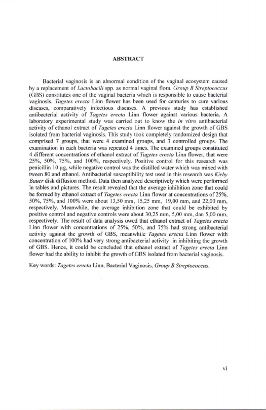 Nurul Fadhliati Maulida, UJI AKTIVITAS ANTIBAKTETRI EKSTRAK ETANOL BUNGA TAHI KOTOK (TAGETES ERECTA LINN) TERHADAP STREPTOKOKUS GRUP B ISOLAT VAGINOSIS BAKTERIALIS SECARA IN VITRO. Banda Aceh Fakultas Kedokteran,2011