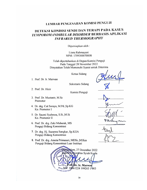 Liana Rahmayani, DETEKSI KONDISI SENDI DAN TERAPI PADA KASUS TEMPOROMANDIBULAR DISORDER BERBASIS APLIKASI INFRARED THERMOGRAPHY. Banda Aceh Program Studi Doktor Matematika Dan Aplikasi Sains Universitas Syiah Kuala,2023
