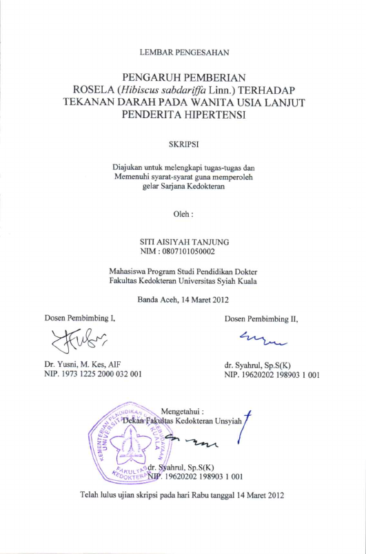 Baca Juga : PENGARUH PEMBERIANRNROSELA (HIBISCUS SABDARIFFA LINN.) TERHADAP TEKANAN DARAH PADA WANITA USIA LANJUTRNPENDERITA HIPERTENSI (Siti Aisiyah Tanjung, 2014)