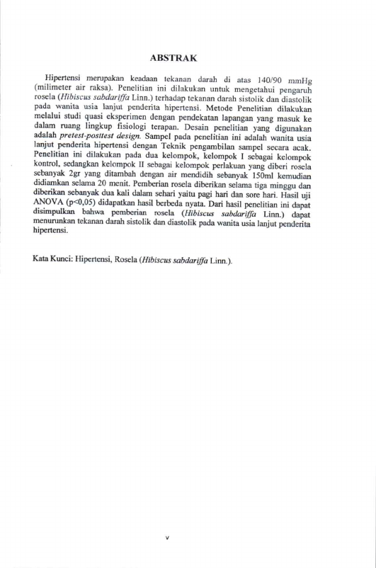 Baca Juga : PENGARUH PEMBERIANRNROSELA (HIBISCUS SABDARIFFA LINN.) TERHADAP TEKANAN DARAH PADA WANITA USIA LANJUTRNPENDERITA HIPERTENSI (Siti Aisiyah Tanjung, 2014)