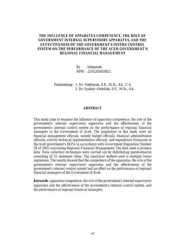 Istiqamah, PENGARUH KOMPETENSI APARATUR, PERAN APARAT PENGAWAS INTERN PEMERINTAH, DAN EFEKTIVITAS SISTEM PENGENDALIAN INTERN PEMERINTAH TERHADAP KINERJA PENGELOLA KEUANGAN DAERAH (STUDI PADA SKPA PEMERINTAH ACEH). Banda Aceh Fakultas Ekonomi dan Bisnis (S2),2023