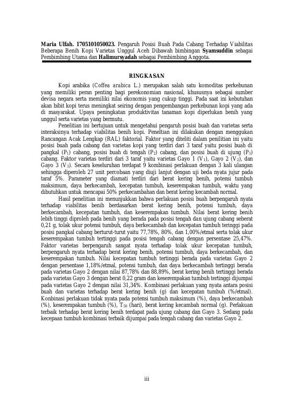 MARIA ULFAH, PENGARUH POSISI BUAH PADA CABANG TERHADAP VIABILITAS BEBERAPA BENIH KOPI VARIETAS UNGGUL ACEH. Banda Aceh Fakultas Pertanian,2023