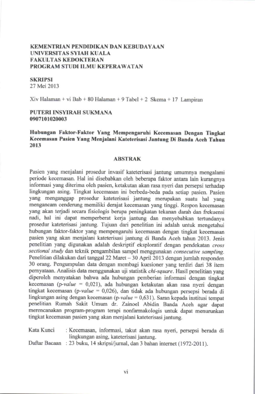 Baca Juga : HUBUNGAN FAKTOR-FAKTOR YANG MEMPENGARUHI KECEMASAN DENGAN TINGKAT KECEMASAN PASIEN YANG AKAN MENJALANI KATETERISASI JANTUNG DI BANDA ACEH 2013 (Puteri Insyirah Sukmana, 2014)