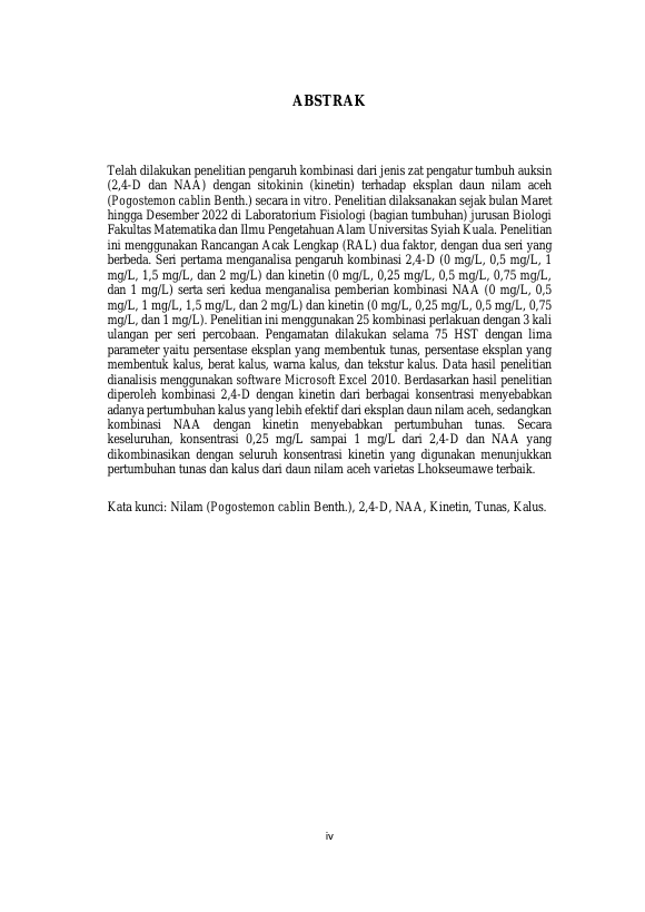 NURTANFIZI, PENGARUH KOMBINASI ZAT PENGATUR TUMBUH AUKSIN DAN SITOKININ TERHADAP EKSPLAN DAUN NILAM ACEH (POGOSTEMON CABLIN BENTH.) SECARA IN VITRO. Banda Aceh Fakultas mipa,2023