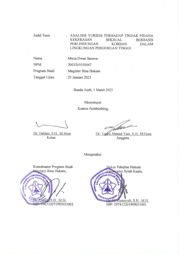 Mirza Dwan Sanova, ANALISIS YURIDIS TERHADAP TINDAK PIDANA KEKERASAN SEKSUAL BERBASIS PERLINDUNGAN KORBAN DALAM LINGKUNGAN PERGURUAN TINGGI. Banda Aceh Fakultas Hukum Universitas Syiah Kuala,2023